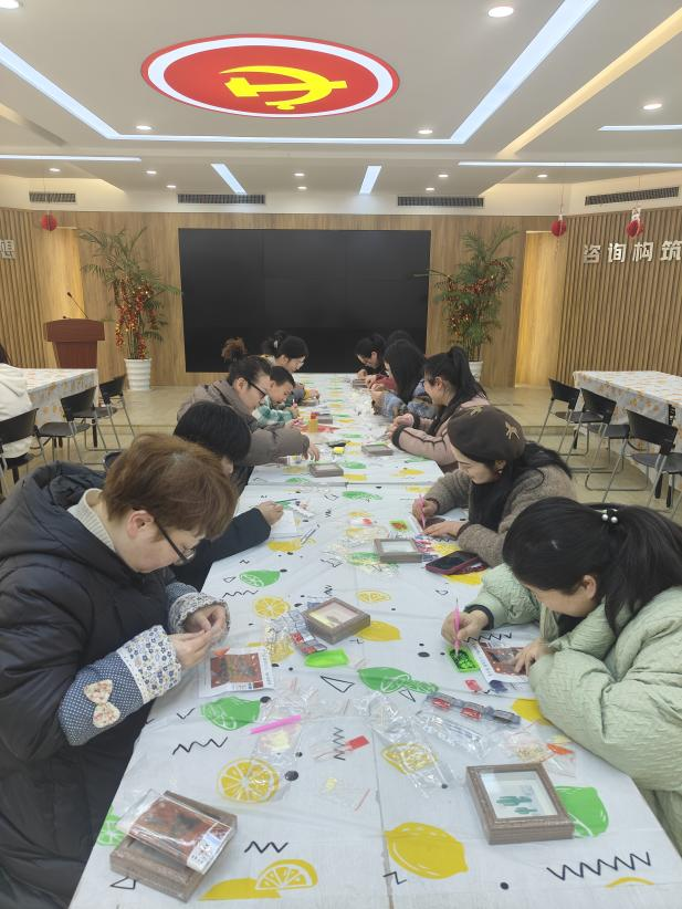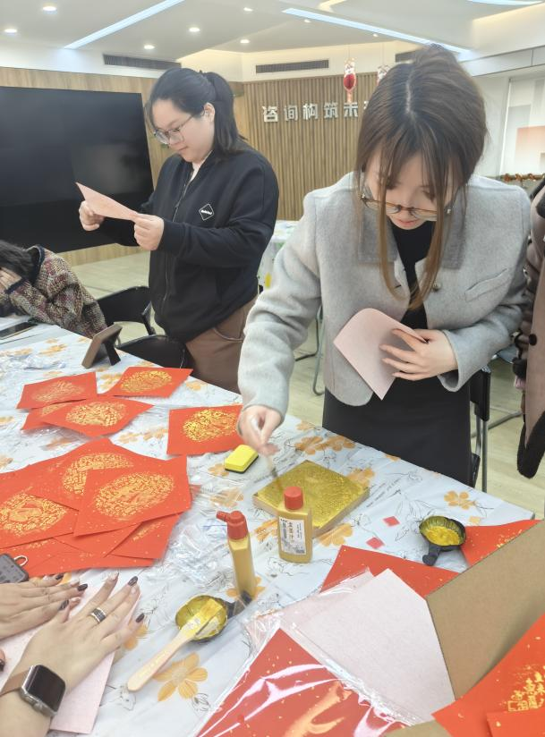 活動現場,布置得溫馨且喜慶,燈籠高掛、春聯映目、年花簇擁,處處洋溢著濃郁的節(jié)日氣息。全體員工熱情響應,踴躍參加。活動伊始,大家有序簽到并領取了手工DIY所需的材料。此次活動準備了多個富有傳統文化韻味的手工項目。福字 DIY 鉆石貼區(qū),員工們專注地將一顆顆閃耀的鉆石鑲嵌在特制模板上,在細致操作中,寓意吉祥的福字逐漸成型;“家和萬事興”“百福圖” 數字油畫 DIY 區(qū)域,大家依據數字標識,用畫筆為畫布填充色彩,每一筆都飽含著對美好生活的期許。木版年畫拓印手工 DIY 處,員工們先將宣紙輕柔覆蓋在刻有精美圖案的木版上,再用蘸滿顏料的刷子均勻刷過紙面,隨后小心翼翼地揭開宣紙,一幅幅承載著歷史記憶與美好寓意的木版年畫便躍然紙上 。經過一個多小時的創(chuàng)作,一幅幅精美的手工作品陸續(xù)誕生。這些作品不僅展示了員工們的才華和技藝,更凝聚了大家的智慧和汗水。