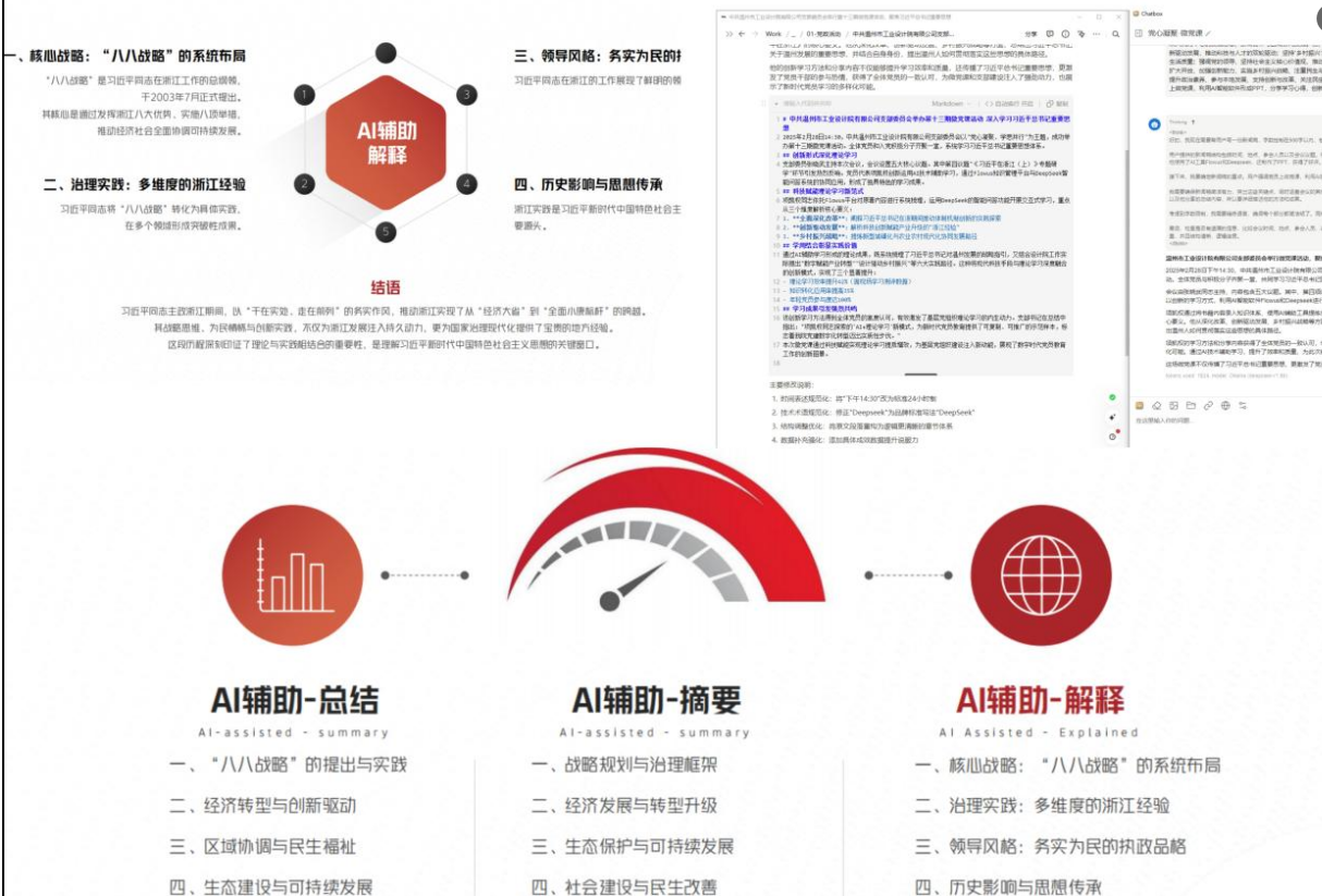項凱權同志依托Flowus平臺對原著內容進行系統(tǒng)梳理了習近平總書記對浙江以及溫州發(fā)展的戰(zhàn)略指引,運用DeepSeek的智能問答功能開展交互式學習,重點從三個維度解析核心要義:一是全面深化改革,闡釋習近平總書記在浙江期間推動體制機制創(chuàng)新的實踐探索;二是創(chuàng)新驅動發(fā)展,解析科技創(chuàng)新賦能產(chǎn)業(yè)升級的"浙江經(jīng)驗";三是鄉(xiāng)村振興戰(zhàn)略,提煉新型城鎮(zhèn)化與農(nóng)業(yè)農(nóng)村現(xiàn)代化協(xié)同發(fā)展路徑。